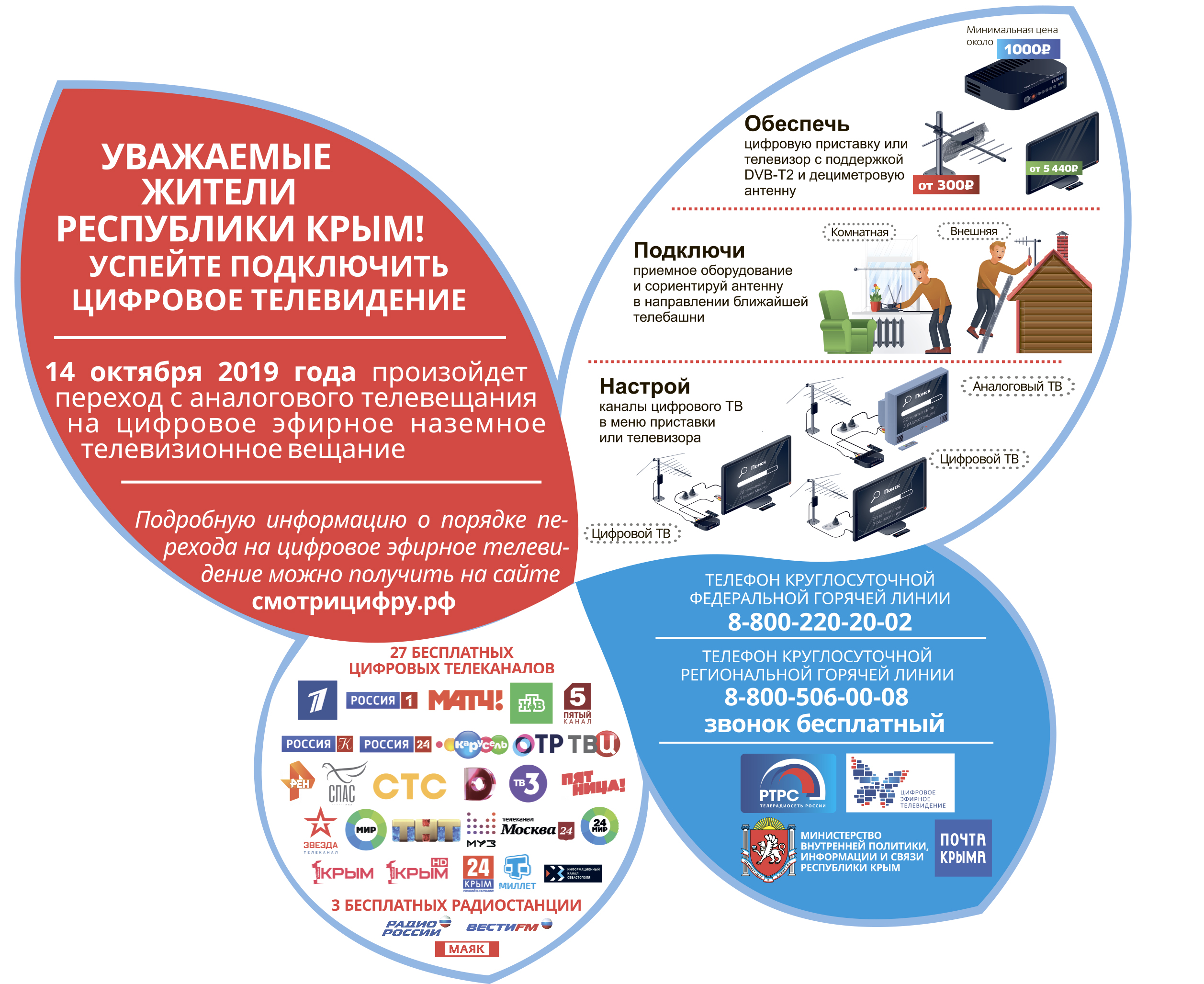 Во исполнение поручения Главы Республики Крым Аксёнова С.В. от 29 августа 2019 года № 1/01-32/5500 Министерством внутренней политики, информации и связи Республики Крым разработан макет двусторонней полноцветной листовки-воблера с информацией о порядке перехода на цифровое эфирное наземное телевизионное вещание.